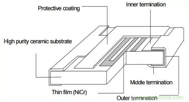 薄膜電阻就是氧化鋁陶瓷基底上通過(guò)真空沉積形成鎳化鉻薄膜,通常只有0.1um厚,只有厚膜電阻的千分之一,然后通過(guò)光刻工藝將薄膜蝕刻成一定的形狀。Thin Film工藝在此前電容和電感的文章中已經(jīng)提到過(guò)多次了,光刻工藝十分精確,可以形成復(fù)雜的形狀,因此,薄膜電容的性能可以控制的很好。