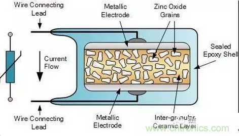 壓敏電阻通常都是金屬氧化物可變電阻,即Metal Oxide Varistor(MOV),其電阻材料是氧化鋅顆粒和陶瓷顆粒混合后一起燒結(jié)成型。MOV的特性就是當(dāng)電壓超過(guò)一定閾值的時(shí)候,電阻迅速下降,可以通過(guò)大電流,因此可以用于浪涌防護(hù)和過(guò)壓保護(hù)。