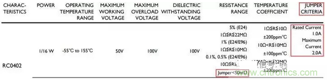此時(shí),就需要從電阻的規(guī)格書(shū)中獲取相關(guān)參數(shù),從下圖可以看出RC0402的零歐姆電阻,其電阻值不會(huì)超過(guò)50mΩ,額定電流不超過(guò)1A,由此就可以判斷電阻是否滿(mǎn)足設(shè)計(jì)要求。通常0402的零歐姆電阻都可以滿(mǎn)足1A以下的電流要求。