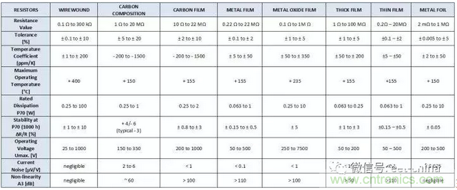 常見(jiàn)類(lèi)型的電阻的主要參數(shù)的對(duì)比如下圖所示,出貨量最大的應(yīng)該是厚膜電阻和金屬膜電阻。
