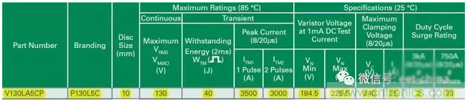 MOV的額定工作電壓,交流場(chǎng)合考慮交流額定電壓,即Vrms或Vm(ac),上圖中的器件可以有效值130V的交流電中正常工作。超過(guò)這個(gè)電壓,MOV可能動(dòng)作或者損壞,導(dǎo)致電路無(wú)法工作。