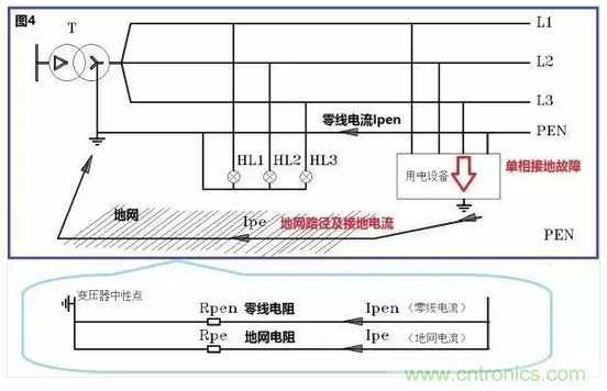 我們看圖4的下圖,我們發現當L3相對用電設備的外殼短路時,保護性中性線中有電流流過,地網中也有電流流過。