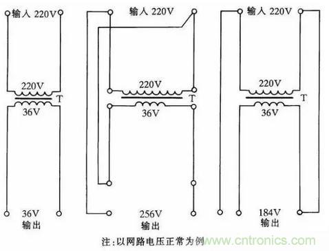 圖中的黑圓點(diǎn)表示繞組的同名端。如果將初、次級的連接線改為同名端相連;則輸出電壓將降低6.3V。采用這種接法;負(fù)載電流不得大于初、次級的額定電流。網(wǎng)路電壓如經(jīng)常比220V低(或高)30~40V;可選220V/36V的變壓器連接。