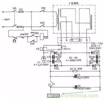 電路中VD1~VD4為4只硅整流二極管;R1~R4、C1~C4組成硅整流器件的過壓保護(hù)電路;FR為過流繼電器,保護(hù)硅整流器件。當(dāng)負(fù)載電流超過額定值時(shí),電流互感器次級電流相應(yīng)增加,帶動(dòng)繼電器FR動(dòng)作,F(xiàn)R常閉觸點(diǎn)打開,接觸器KM釋放,觸點(diǎn)打開切斷電焊機(jī)電源。硅整流器件用0.25kW風(fēng)扇作風(fēng)冷設(shè)備。圖中,C5為濾波電容,R5為泄放電阻。