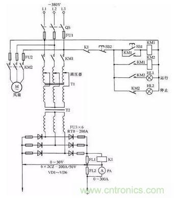 在電鍍過程中,常常利用硅整流器件的調(diào)壓電路進(jìn)行工作,其工作原理如圖41所示。當(dāng)需進(jìn)行工作時(shí),按下按鈕SB1,接觸器KM1線圈通電,主回路中觸點(diǎn)閉合,線路輸出直流電壓。與此同時(shí),KM2也得電動(dòng)作,接通電扇,對硅整流器件以及調(diào)壓器吹冷風(fēng)降溫。線路中KI為過流繼電器。