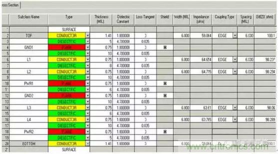 由上面的分析知道,PCB板的疊層設(shè)置和信號(hào)的耦合以及阻抗計(jì)算都有著密切的關(guān)系,所以在開始PCB設(shè)計(jì)之前必須進(jìn)行疊層設(shè)計(jì),然后進(jìn)行信號(hào)的阻抗計(jì)算。在本設(shè)計(jì)中的疊層設(shè)計(jì)見下圖: