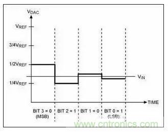 每個時鐘沿,比較器對電容上的電壓和地作比較, 由此結果來決定下一個電容是否接入電路。