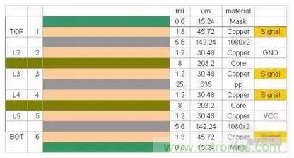 當制作某一特定厚度的印制板時,一方面要求合理地選擇各種材料的參數,另一方面,半固化片最終成型厚度也會比初始厚度小一些。下面是一個典型的6層板疊層結構: