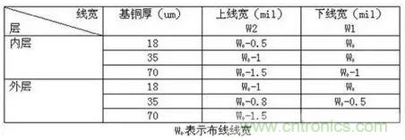 我們會以為導線的橫截面是一個矩形,但實際上卻是一個梯形。以TOP層為例,當銅箔厚度為1OZ時,梯形的上底邊比下底邊短1MIL。比如線寬5MIL,那么其上底邊約4MIL,下底邊5MIL。上下底邊的差異和銅厚有關,下表是不同情況下梯形上下底的關系。