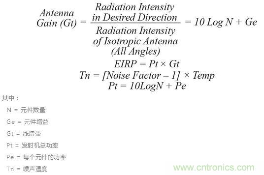 在設(shè)計(jì)時(shí)要考慮陣列大小與每個(gè)輻射元件的功率之間的權(quán)衡關(guān)系,這些元件會(huì)影響波束的方向性和有效輻射功率??梢酝ㄟ^考察一些常見的品質(zhì)因數(shù)來預(yù)測(cè)天線的性能。通常,天線設(shè)計(jì)人員會(huì)考察天線增益、有效各向輻射功率 (EIRP) 及Gt/Tn。有一些基礎(chǔ)等式可用于描述以下等式中所示的這些參數(shù)。我們可以看到,天線增益和EIRP與陣列中元件的數(shù)量成正比。這可能導(dǎo)致地面雷達(dá)應(yīng)用中常見的大型陣列。