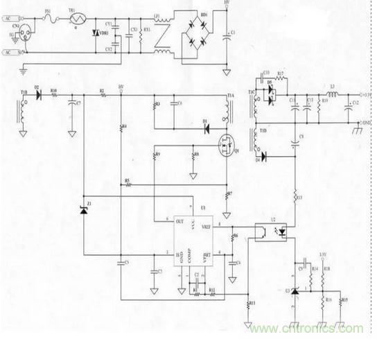 主要用于調(diào)整PWM IC的VCC電壓,以目前使用的3843而言,設(shè)計(jì)時(shí)VCC必須大于8.4V(Min. Load時(shí)),但為考慮輸出短路的情況,VCC電壓不可設(shè)計(jì)的太高,以免當(dāng)輸出短路時(shí)不保護(hù)(或輸入瓦數(shù)過大)。
