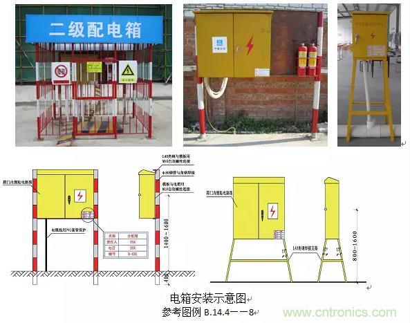 3、配電箱、開(kāi)關(guān)箱應(yīng)裝設(shè)端正、牢固;固定式配電箱、開(kāi)關(guān)箱的中心點(diǎn)與地面的垂直距離應(yīng)為1.4~1.6m;移動(dòng)式配電箱、開(kāi)關(guān)箱應(yīng)裝設(shè)在堅(jiān)固的支架上,其中心點(diǎn)與地面的垂直距離宜為0.8~1.6m。(JGJ46-2005第8.1.8條)