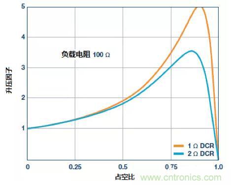 圖2中曲線的變化真實(shí)地顯示出輸出端負(fù)載電阻和電感的直流電阻的改變,對升壓因子造成的影響。假設(shè)負(fù)載電阻為100Ω,48V的輸出電壓,這對應(yīng)于負(fù)載電流480mA。當(dāng)電感的串聯(lián)電阻(DCR)只有2Ω,最大升壓因子是有可能剛好超過3; 但對于DCR為1Ω,略高于5的升壓因子是可以實(shí)現(xiàn)的。如要求更高的升壓因子,就必須選用具有更低的串聯(lián)電阻值的電感。