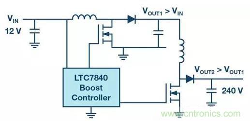 而另一個獲得較高升壓因子的方案就是使用多相 (Multi Output Phases)。以ADI公司的LTC7840芯片為例,當(dāng)中包含兩個升壓控制器。這使得實(shí)現(xiàn)兩相升壓概念變得容易。圖三顯示了電源電壓為12V的示例,輸出升壓至240V電壓。兩相升壓級將電壓分開增加,使得每級僅需要將電壓增加約4.5倍。