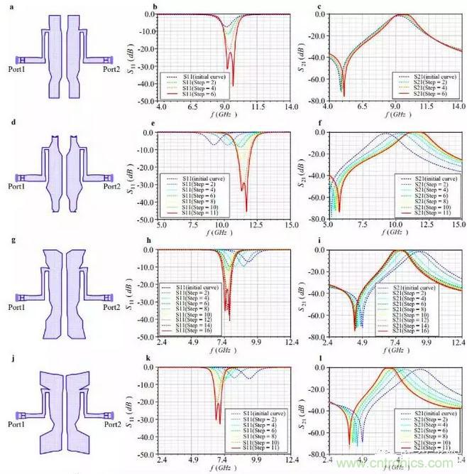 第二項(xiàng)任務(wù)和第三項(xiàng)任務(wù)的AI首先學(xué)會(huì)調(diào)整諧振器的長度,以達(dá)到移動(dòng)中心頻率的目的,然后調(diào)整諧振器之間的耦合系數(shù),以減少通帶回波損耗,增加插入損耗,其設(shè)計(jì)過程如圖3(d-i)所示。