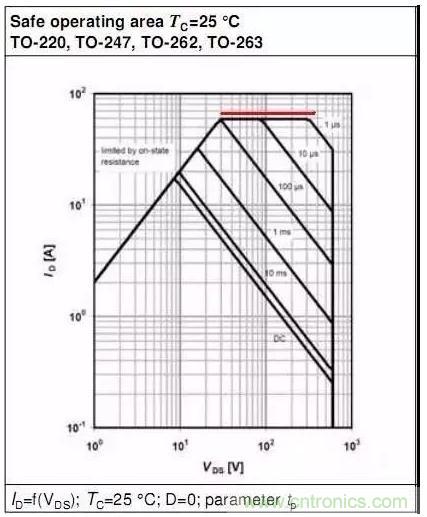 此部分為MOSFET的最大脈沖電流限制,此最大電流對(duì)應(yīng)ID_pulse.