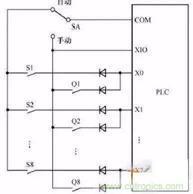 如圖上系統(tǒng)分自動(dòng)和手動(dòng)兩種工作方式,Q1-Q8為手動(dòng)方式用到的 輸入信號(hào),S1-S8為自動(dòng)方式用到的輸入信號(hào)。S1和Q1共用輸入點(diǎn)X0,PLC運(yùn)行時(shí)只會(huì)用到其中一組信號(hào),所以可以共用PLC的輸入點(diǎn)。(圖中二極管是用來(lái)防止寄生回路,避免錯(cuò)誤輸入信號(hào)的產(chǎn)生。