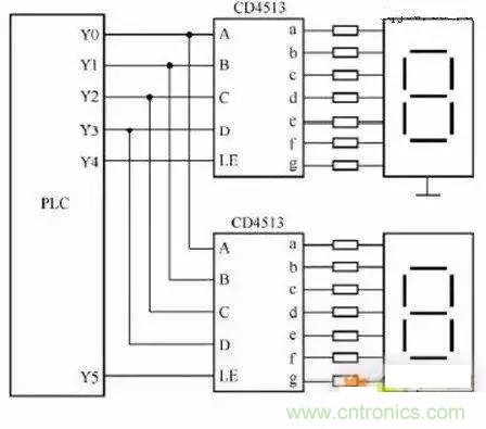 上圖兩只CD4513的數(shù)據(jù)輸入端A-D共用PLC四個(gè)輸出端Y0-Y3,A為最底D為最高,LE 為寄存輸入端,當(dāng)LE 為高電平時(shí),輸入數(shù)據(jù)將存在芯片內(nèi)的寄存器中,并將其譯碼后顯示出來(lái)。如PLC使用繼電器輸出模塊時(shí),與CD4513相連的輸出各端在接一個(gè)下拉電阻,避免輸出繼電器斷開(kāi)的時(shí)候CD4513輸入端懸空。