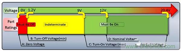 從1.2VDC到9VDC, 繼電器處于不確定的范圍內。(黃色區域)