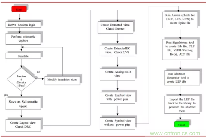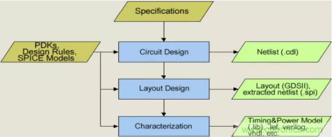 對于數(shù)字電路中的標準單元設計,是從布爾邏輯(Boolean logic)描述并定義單元的邏輯關系開始,接著是電路設計(schematic capture或circuit design)與電路仿真(circuit simulation),而后開始版圖設計。版圖設計需要符合制造工藝規(guī)則檢查(design rule check,DRC)和版圖電路一致性檢查(layout versus schematic,LVS)通過才算完成,這時,版圖設計的結果用“圖形顯示系統(tǒng)第二版”(graphic display system II,GDSII)文件記載,并作為芯片制造中制作掩模板(mask)的依據(jù)。數(shù)字電路的標準單元和I/O單元完成版圖設計后,還要做寄生參數(shù)(電阻R電容C)提取(parasitic extraction,RCX),供電路設計者作進一步擬合優(yōu)化處理,這種反標方法(back-annotation)也是芯片級設計的重要步驟之一。圖2給出了比較完整的版圖設計全流程圖。