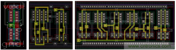 對于標準單元的版圖,根據(jù)工藝要求,標準邏輯單元的高度是固定的,寬度為最小單元寬度的公約數(shù)倍數(shù),例如在圖3中,左圖為反向器(inverter,INV)的版圖,中圖為選擇器(multiplexer,MUX)的版圖,右圖為D型寄存器的(D-Flip Flop, DFF)的版圖。如上所述,從版圖設計中,可以導出并建立GDSII和LEF文件。GDSII文件經(jīng)過設計簽核(design sign-off)過程由代工廠使用于芯片制造,LEF文件用于全芯片的P&R物理設計。