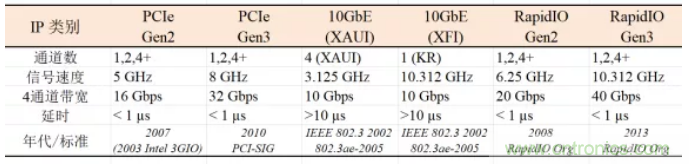 物聯(lián)網(wǎng)和5G聯(lián)網(wǎng)通信中除了信號收發(fā)單元(transceiver, TRX 以及TX/RX)設計芯片之外,離不開專用的系統(tǒng)芯片SoC,其中高性能與高速核心IP往往決定了SoC的性能和速度。常見的高性能與高速核心IP有: PCIe, 10 Gigabit Ethernet (10 GbE), RapidIO, SerDes, USB等。表1列出了幾種物聯(lián)網(wǎng)和5G時代常用的高性能與高速IP的信號速度和數(shù)據(jù)率。