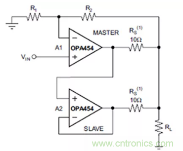 第一種方法是將兩個(或更多)OPA454AIDDAR并聯(圖5)