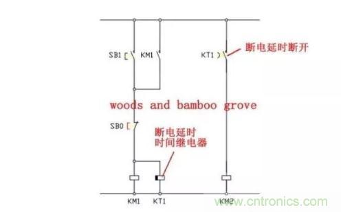 2 ,停止時,按下停止按鈕SB0,交流接觸器KM1和斷電延時時間繼電器KT1斷電釋放,KT1的斷電延時斷開觸點經過設定的時間后復位斷開。交流接觸器KM2斷電釋放。實現了交流接觸器KM1斷電釋放一段時間后,交流接觸器KM2才斷電釋放的控制要求。