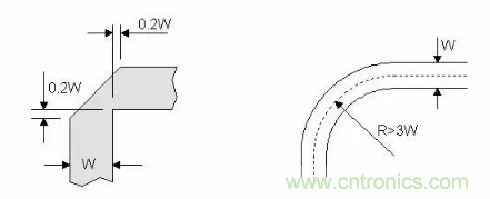 RF信號(hào)線如果走直角,拐角處的有效線寬會(huì)增大,阻抗不連續(xù),引起信號(hào)反射。為了減小不連續(xù)性,要對(duì)拐角進(jìn)行處理,有兩種方法:切角和圓角。圓弧角的半徑應(yīng)足夠大,一般來說,要保證:R>3W。如圖右所示。