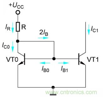 如圖1所示為鏡像恒流源電路,它由兩只特性完全相同的管子VT0和VT1構(gòu)成,由于VT0管的c、b極連接,因此UCE0=UBE0,即VT0處于放大狀態(tài),集電極電流IC0=β0*IB0。另外,管子VT0和VT1的b-e分別連接,所以它們的基極電流IB0=IB1=IB。設(shè)電流放大系數(shù)β0=β1=β,則兩管集電極電流IC0=IC1=IC=β*IB。可見,由于電路的這種特殊接法,使兩管集電極IC1和IC0呈鏡像關(guān)系,故稱此電路為鏡像恒流源(IR為基準(zhǔn)電流,IC1為輸出電流)。