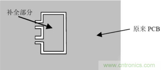 不規(guī)則形狀且沒拼板的PCB 應加工藝邊。若PCB 上有開孔大于等于5mm×5mm的地方,在設計時要先將孔補全,以避免焊接時造成漫錫和板變形,補全部分和原有的PCB 部分要以單邊幾點連接,在波峰焊后將之去掉(見圖3.2)
