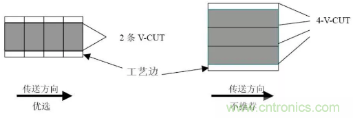 拼板方向應平行傳送邊方向設計, 當尺寸不能滿足上述拼版尺寸要求的例外。一般要求“V-CUT”或郵票孔線數(shù)量≤3(對于細長的單板可以例外),見圖3.4。