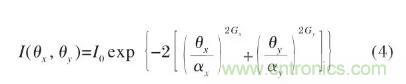 式中:I0為z軸上光強;θx和θy分別是光束與x-z面和y-z面夾角;αx和αy分別為x和y方向上高斯強度1/e2點的遠場束散角;Gx和Gy分別是x和y方向上的“超級高斯因子”,其值為1時,是典型的高斯分布。對于實際LD,其快軸和慢軸方向上的超高斯因子Gx和Gy均大于1,表征實際輸出的激光束中除基模外還包含其他的高階模分量。