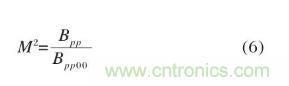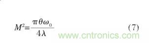 式中:Bpp為實際光參量乘積;Bpp00為高斯光參量乘積;光束質量因子M2表征實際光束相比衍射極限(基模高斯光束)的倍數,將基模高斯光束的束散角θ0=4λ/πω0及公式(4)代入公式(6),則可得: