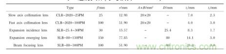 仿真時使用SIGMA KOKI公司生產的透鏡,表2列出了透鏡的參數,其中f為焦距,r為曲率半徑,A×B為柱面透鏡長×寬,D為球面透鏡直徑,te為透鏡邊緣厚度,tc為透鏡中心厚度。
