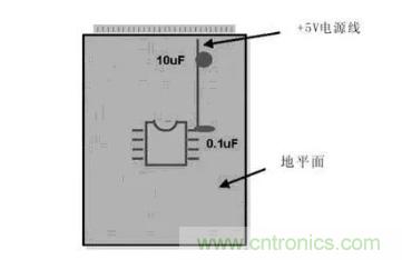 在布線時,模擬器件和數字器件都需要這些類型的電容,都需要靠近其電源引腳連接一個電容,此電容值通常為0.1uF。系統供電電源側需要另一類電容,通常此電容值大約為10uF。