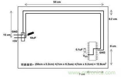 在圖3此單面板中,到電路板上器件的電源線和地線彼此靠近。此電路板中電源線和地線的配合比圖2中恰當。電路板中電子元器件和線路受電磁干擾(EMI)的可能性降低了679/12.8倍或約54倍。