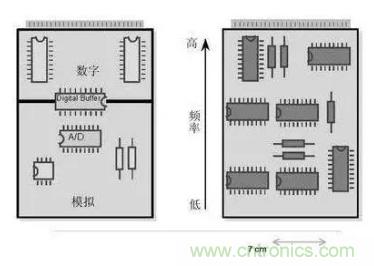 圖4 (左)將數字開關動作和模擬電路隔離,將電路的數字和模擬部分分開。(右)要盡可能將高頻和低頻分開,高頻元件要靠近電路板的接插件。