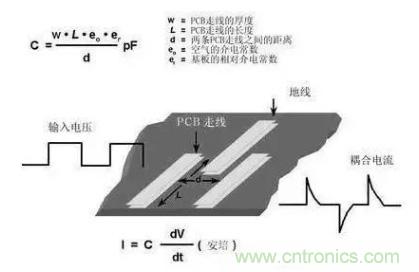 在這兩種走線配置中,一條走線上電壓隨時間的變化(dV/dt)可能在另一條走線上產生電流。如果另一條走線是高阻抗的,電場產生的電流將轉化為電壓。