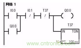3.延時啟停控制電路該電路要求有輸入信號后,停一段時間輸出信號才為ON;而輸入信號0FF后,輸出信號延時一段時間才OFF。T37延時3 s作為Q0.0的啟動條件,T38延時5 s作為Q0.0的關斷條件。
