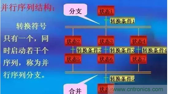 并行序列的結束稱為合并。轉換符號在水平線以下,當雙水平線之上的所有前級都處于活動狀態時,且轉換條件成立,則下一步被激活。同時所有前級步都變為不活動步。