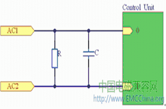 為了防止控制板電路產(chǎn)生的傳導(dǎo)干擾,可在電路的進(jìn)入口(即AC兩端)并接上一個電容C,圖1所示是一個簡單的電容抗擾電路連接圖。圖中的電容屬于安全電容,但必須在該電容的兩端并聯(lián)一個安全電阻,以防止電源線拔插時電源線插頭長時間帶電。因?yàn)榘踩珮?biāo)準(zhǔn)規(guī)定,當(dāng)正在工作之中的機(jī)器電源線被拔掉時,在兩秒鐘內(nèi),電源線插頭兩端所帶的電壓(或?qū)Φ仉娢?應(yīng)小于原來電壓的30%。