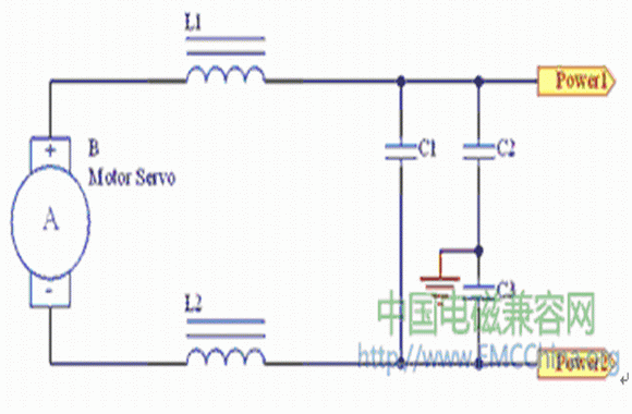 該電路的目的是為干擾電勢提供一個低阻抗的通路,以抑制干擾值。圖2中,C1為電感成分較小的電容,一般為幾十至幾百納法;C2選穿心電容,一般為1~4.7 nF。增加該電容的目的是為了抑制噪聲,但電容的安裝位置不同,以甚高頻段的干擾抑制效果會有很大變化,所以,安裝時要特別注意電容的接地外殼應(yīng)與電動機(jī)座或金屬外殼的最短連接。同時應(yīng)在連線時使電容器的輸入、輸出部分的電磁耦合盡可能地減少。