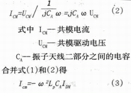 這里UCM就是產(chǎn)生共模輻射的驅(qū)動(dòng)源。要產(chǎn)生輻射,除了源以外還必須有天線。這里的天線有兩部分組成,一部分是由A點(diǎn)向左看的地線部分,另一部分是由B點(diǎn)向右看的地線部分和外接電纜。其組成的輻射系統(tǒng)的等效電路如圖1(b)所示,這實(shí)際上是一付不對稱振子天線。流過天線的電流即為共模電流,可用下式表示