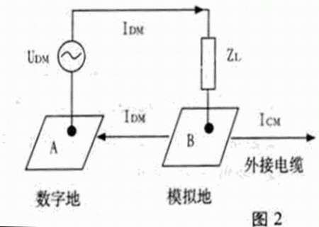 例1:在印制電路板上為了把數(shù)字部分和模擬部分隔離,常把地分割成數(shù)字地和模擬地。如果這兩部分之間有信號(hào)聯(lián)系,如圖2所示,并且數(shù)字地和模擬地的連接部分AB比較細(xì)長,存在一定電感,則差模電流IDM將在AB連接線的電感上產(chǎn)生共模驅(qū)動(dòng)電壓源,從而引起共模輻射,天線一部分是數(shù)字地,另一部分是模擬地和外接地線。