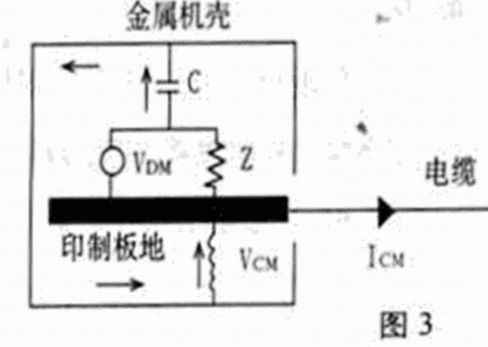 例2:印制電路板的地通過接地導(dǎo)線與機(jī)殼相連,如圖3所示。印制板上有信號(hào)線與機(jī)殼貼近,于是差模源VDM通過分布電容C耦合到機(jī)殼上,引起差模電流,該電流通過機(jī)殼和接地線又回到印制板的差模源。如果接地線存在一定的電感L,則差模電流在L上產(chǎn)生電壓降VCM,成為共模驅(qū)動(dòng)電壓,從而引起共模輻射。這時(shí)天線的一部分是外接地線,另一部分是機(jī)殼。這種輻射常發(fā)生在以下情況,例如設(shè)備內(nèi)部的地址線、數(shù)據(jù)線等扁平電纜貼近機(jī)殼,分布電容較大,印制板和機(jī)殼之間的連接線細(xì)長或接觸不良等等。