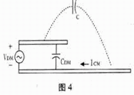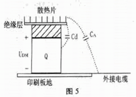 圖5是電壓驅(qū)動(dòng)模式的一個(gè)實(shí)例。圖中Q是大功率的開關(guān)管,Q可看成是差模電壓源UDM,共模電流ICM的途徑是由Q通過開關(guān)管和散熱片之間的分布電容Cd到達(dá)散熱片,散熱片是共模天線的一個(gè)極。然后以空間位移電流的形式,即通過C A到達(dá)外部接線,外部接線是天線的另一個(gè)極,共模電流再由印制板地回到Q。