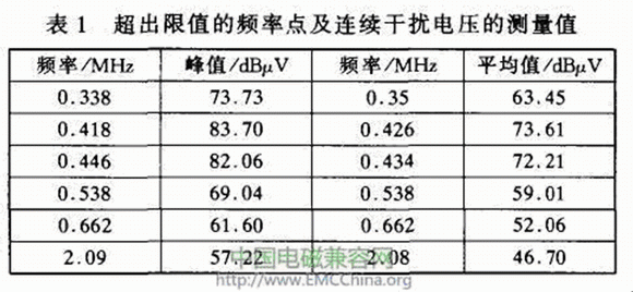 圖1是某一臺空調(diào)產(chǎn)品連續(xù)干擾電壓的測試曲線(執(zhí)行GtM343.1—2003《家用和類似用途電動、電熱器具,電動工具以及類似電器無線電干擾特性測量方法和允許值》l11)。表1是超出限值的一些頻率點及連續(xù)干擾電壓的峰值和平均值的測量值。