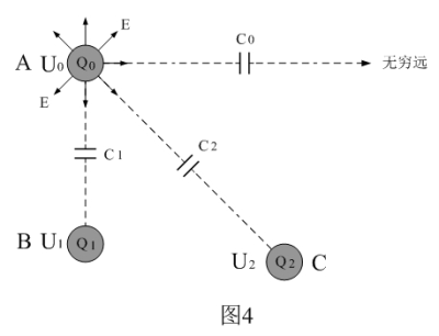 圖4是帶電物體對其它物體產生感應的原理圖。圖4中,A是帶電物體,其電位為U0,E表示電場強度或電場力線,Q0為其帶電量;帶電物體A對物體B和物體C均會產生電場感應,U1和U2分別為物體B和物體C被物體A感應產生的對地電位;Q1和Q2分別為物體B和物體C被物體A感應產生的電荷量。帶電物體A的電荷Q0越多,其電位U0就越高,并且其對物體B或物體C產生感應影響的力度就越大。