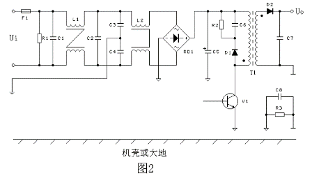 圖1 是一個普遍應(yīng)用的反激式(或稱為回掃式)開關(guān)電源工作原理圖,50Hz 或60Hz 交流電網(wǎng)電壓首先經(jīng)整流堆整流,并向儲能濾波電容器C5 充電,然后向變壓器T1與開關(guān)管V1組成的負載回路供電。圖2 是進行過電磁兼容設(shè)計后的電原理圖。